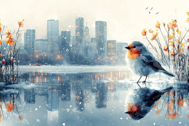 Crisp winter air lingers over the reflective waters, casting a mirror-like image of Edmonton's skyline under a subdued gray sky, peppered by the delicate snowfall. A vibrant robin, its orange breast contrasting sharply against the monochrome backdrop, perches quietly by the water’s edge. The city buildings, softened by the snow, jut into the sky like distant crystals, their windows twinkling with the warmth of hidden lives. Tall, barren trees and scattered orange leaves frame this serene moment, adding a splash of color to this chilled urban landscape. The artwork’s brushstrokes evoke a sense of tranquility and isolation, a reminder of nature’s quiet endurance amidst urban sprawl. *** About Edmonton Skyline: Edmonton, the capital city of Alberta, Canada, is known for its vibrant arts community and numerous festivals, earning it the nickname "Canada's Festival City." The city skyline features a mix of modern and historic architecture that reflects Edmonton's dynamic culture and bustling economy. Despite harsh winter conditions, Edmontonians embrace the season with outdoor festivals and markets. The skyline depicted in the image captures the essence of the city, combining nature with urban life, symbolizing resilience and beauty.