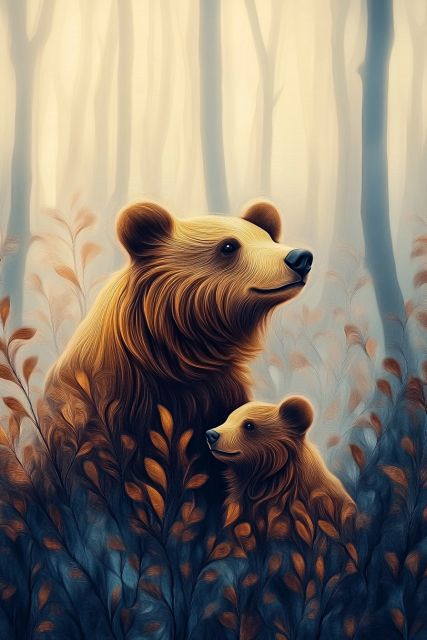 Captured in a serene embrace, a mother bear and her cub stand amidst a mystically foggy forest blanketed in autumn hues. The artwork exudes warmth with its soft golden and brown tones encapsulating the gentle giants. Tall, slender trees rise in the background, their silhouettes fading into a misty backdrop, which lends an ethereal feel to the scene. The mother bear, with eyes full of wisdom, gazes ahead while her cub looks up to her, embodying trust and innocence. This art piece is not just visually stunning but also evokes a strong sense of protection and familial bonds within nature's embrace. The detailed rendering of fur and foliage adds a lifelike and textured quality, making it a captivating piece for any wall. ***About Brown Bears***: Brown bears, also known scientifically as Ursus arctos, are large mammals found in numerous sub-species across North America, Europe, and Asia. This species can vary greatly in size and color, typically exhibiting a fur color range from dark brown to light tips and even blonde, depending on their location and subspecies. Brown bears' diets are omnivorous, where they consume a variety of foods based on seasonal availability. This can include fruits, nuts, leaves, as well as larger prey like fish and small mammals. Brown bears are known for their incredible strength and ability to adapt, making them fascinating subjects of both art and scientific study.