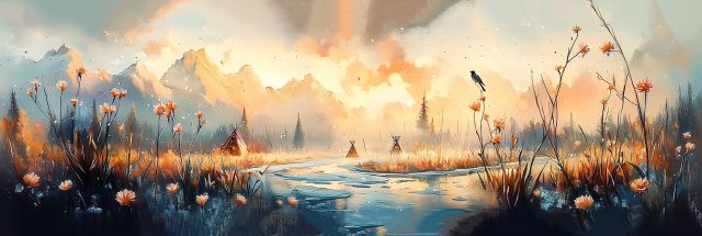 Bathed in the golden hues of a setting sun, the serene marshlands of Edmonton come alive in this captivating canvas print. In the foreground, delicate wildflowers sway gently, dotting the lush greenery with bursts of orange and white. A meandering stream reflects the fiery sky above, leading the viewer's eye towards a group of modest tepees nestled peacefully along the water's edge. Majestic mountains loom in the distance, their peaks shrouded in mist, enhancing the ethereal mood of the landscape. A lone bird perched on a reed stands as a silent observer to the tranquility. This artwork, with its vivid colors and dynamic composition, invokes a sense of calm and wonder, transporting observers to a tranquil escape within nature's embrace. *** About Tepees: Originally used by the indigenous peoples of North America, tepees (also spelled tipis) are cone-shaped tents traditionally made of animal skins and wooden poles. Their design allows them to be easily dismantled and transported, making them well-suited for nomadic lifestyles. Known for their resilience to weather and efficient heating and cooling properties, tepees remain symbolic of Native American culture and heritage, representing harmony with nature, resourcefulness, and familial warmth.