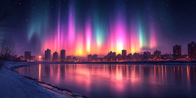 | Spectacular Aurora Borealis Display Over Edmonton Skyline and River Bathed in ethereal lights, Edmonton's skyline emerges under a captivating display of the Aurora Borealis. Vivid hues of pink, purple, green, and blue dance across the night sky, mirrored by the still waters of the river below, creating a mesmerizing visual symphony. This scene captures a winter night where nature's palette blends seamlessly with urban life, illuminating the snow-dusted riverbanks and the architectural contours of the city. The glimmering lights of the buildings add a human touch to the otherwise surreal, natural spectacle. In the foreground, the crisp, white snow lining the riverbank contrasts starkly with the dark night, enhancing the luminosity of the aurora overhead. This image not only showcases the beauty of Edmonton in winter but also highlights the rare and magical occurrences that can appear when conditions are just right.