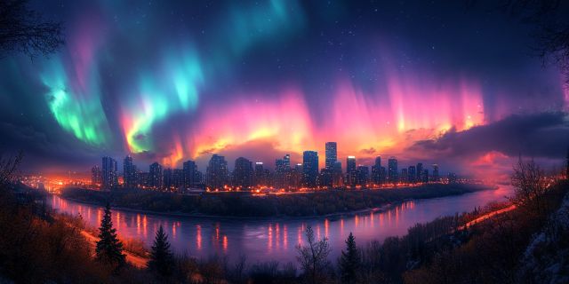 Bathed in the ethereal glow of the aurora borealis, Edmonton's cityscape comes alive with vibrant hues of pink, purple, and green, reflecting majestically over the calm waters of the North Saskatchewan River. The panoramic view captures the natural spectacle of the Northern Lights as they dance above a modern urban skyline, showcasing a perfect blend of nature's artistry and human achievement. The twinkling lights of the city buildings add a sparkling contrast to the vivid colors streaked across the sky, while the river below mirrors this celestial display, enhancing the visual symphony of colors. The scene is framed by the silhouetted trees on the riverbanks, adding a touch of serene wilderness to the composition. This image not only highlights the beauty of Edmonton in a rare and magical moment, but also serves as a reminder of the breathtaking phenomena that occur when natural and urban environments converge under extraordinary atmospheric conditions. *** About Aurora Borealis: The Aurora Borealis, also known as the Northern Lights, is a natural light display predominantly seen in high-latitude regions around the Arctic and Antarctic. It is caused by the interaction of the Earth's magnetic field with charged particles from the sun. These particles collide with gases in Earth's atmosphere, resulting in displays that vary in color depending on the type of gas involved. The most common colors are green and pink, produced by oxygen molecules located about 60 miles above the earth, while nitrogen produces blue or purplish-red aurora. The phenomenon can take many forms, including patches, scattered clouds of light, streaming rays, or arc-like features that can illuminate the night sky with an eerie glow.