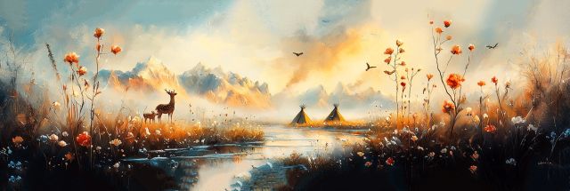 Bathed in the golden hues of a rising sun, a serene landscape unfolds, capturing the tranquil essence of an untouched wilderness. A graceful deer stands by a calm, reflective lake, surrounded by flourishing wildflowers and soft, damp grass. In the background, the silhouette of a mountain range shrouded in mist adds a majestic touch to the scene, creating a sense of depth and mystery. Above, birds glide gracefully under the amber sky, their flight paths intertwining with the soft clouds. To the right, two tents nestled on the water’s edge suggest a human presence, harmoniously integrated into the natural setting. This canvas encapsulates a moment of pure connection with nature, inviting viewers to pause and reflect on the beauty and peace of the natural world. ***About the Deer***: The deer in this artwork symbolizes gentleness and calmness, often associated with the mystical aspect of forests and natural landscapes. In various cultures, deer represent kindness and are seen as guides to navigate through life's spiritual journey. They are also respected as creatures that are deeply connected with the earth, embodying grace and agility. In this image, the deer enhances the serene and harmonious atmosphere, inviting contemplation of nature’s subtle and beautiful interactions.