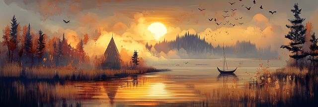 Bathed in the warm glow of a setting sun, a serene landscape unfolds where water and sky meet in a dance of shimmering colors. The scene is a picturesque tranquility, where a small boat rests gently on a calm lake, beneath skies scattered with flocks of birds marking their passage towards distant horizons. Majestic trees line the water's edge, their autumn hues echoed in the mirrored surface below. This canvas captures the essence of peace and natural beauty, inviting the viewer to pause and immerse in a moment of reflective solitude. Nature's grandeur is depicted in the detailed textures of the foliage and the soft diffusion of light, crafting a visual experience that resonates with anyone who appreciates the outdoors. *** About Sunsets: Sunsets have captivated human imagination for millennia, symbolizing both the transient nature of life and the promise of renewal. As the sun dips below the horizon, it paints the sky in a palette of colors, from fiery reds to deep purples, influenced by the scattering of light through atmospheric particles. This daily phenomenon provides not only a spectacle of beauty but also serves as a scientific illustration of the Earth's rotation and atmospheric conditions.