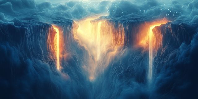 Plunging into an ethereal scene, viewers are greeted by the mesmerizing spectacle of celestial fires cascading through towering clouds of a deep blue sea. In this artistic rendering, the impossible becomes vividly alive: fiery streams defy the aquatic norm, presenting a stark and beautiful contrast between the fluid coolness of oceanic depths and the raw intensity of molten flames. The image's dynamic composition balances the contrasting elements of fire and water, suggesting a mythical interplay that transcends natural laws. The deep colors and fluid textures seem to swirl together, integrating the fiery luminescence with the surrounding darkness of the deep blue sea, capturing a moment that feels both timeless and fleeting. This piece would serve as a captivating centerpiece in any space, inviting onlookers to contemplate the power and beauty of elemental forces in unison. *** About Conceptual Art: Conceptual art, as exemplified by dramatic digital creations like this one, often transcends traditional boundaries to explore themes of nature, mythology, and the interplay between different elements. Such artworks employ a mix of digital tools and artistic vision to craft scenes that evoke deep thought and emotional response, allowing viewers to interpret vast narratives within the confines of visual expression. This form of art is celebrated for its ability to convey complex messages and evoke a spectrum of responses through purely visual means, making it a profound commentary on the interaction of natural forces.