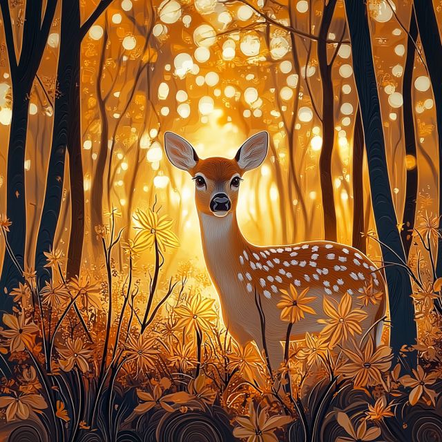 Title: Mesmerizing Golden Hour Captured with a Fawn in Enchanted Woods Photo ID: 85821