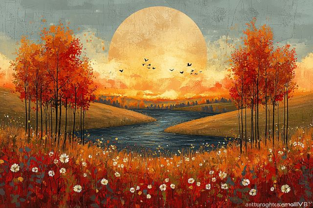 Title: Autumn Reverie: Sunset Hues and River Views in Vibrant Canvas Art Photo ID: 86017