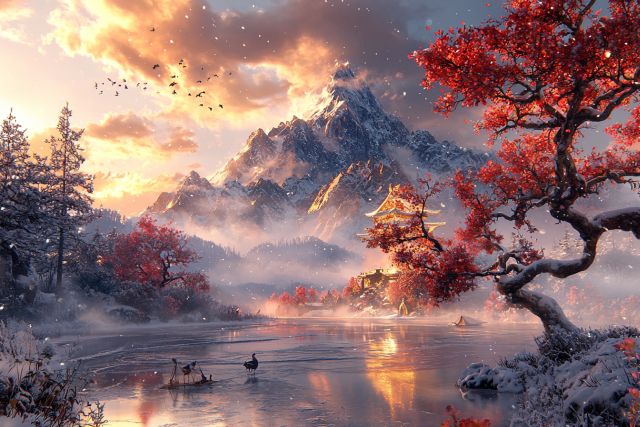 Title: Enchanting Winter Sunset Over a Mystical Frozen Landscape