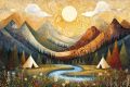 Majestic Mountain Vista with Tranquil River and Teepees Canvas Art