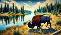 Majestic Bison Grazing by Reflective Lake Amidst Verdant Pines