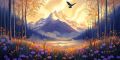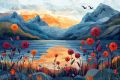 Vibrant Sunrise over Serene Mountain Lake with Blooming Flowers