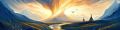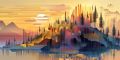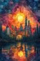 Surreal Sunset Over Water with Fantastical Skyline and Trees