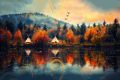 Autumn Reflections: Tipis Amidst Fiery Foliage by a Misty Lake