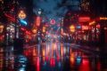 Vibrant Night Lights Reflecting on Wet Streets of Edmonton