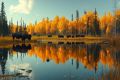 Majestic Bison Grazing by Reflective Waters Among Autumn Trees