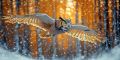 Majestic Owl Soaring Over Snowy Winter Forest at Dusk