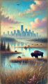 Sunset over Elk Island with Bison and Edmonton Skyline in Pastel Hues
