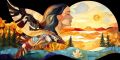 Enchanting Sunset Over a Scenic Lake with Soaring Birds and Mountains