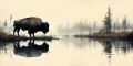 Solitary Bison Reflects in a Misty Edmonton Morning Landscape