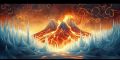 Fiery Peaks Rising from Misty Waters: A Surreal Landscape