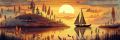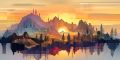 Majestic Sunset Over a Fantasy River Landscape with Sailing Ships